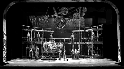 该剧的舞美布景相对是比较简洁的,由几个环形的钢架结构不断变化组合而成。在上半场时,这种转换还能够带出一些视觉上的变化和新鲜感,但到了下半场,类似的转换就显得有点重复。通常音乐剧在上下半场都会在舞美上有比较大的变化,即使没有,也应该在使用手法上注意区分层次,有层层递进感为佳,以免观众审美疲劳。