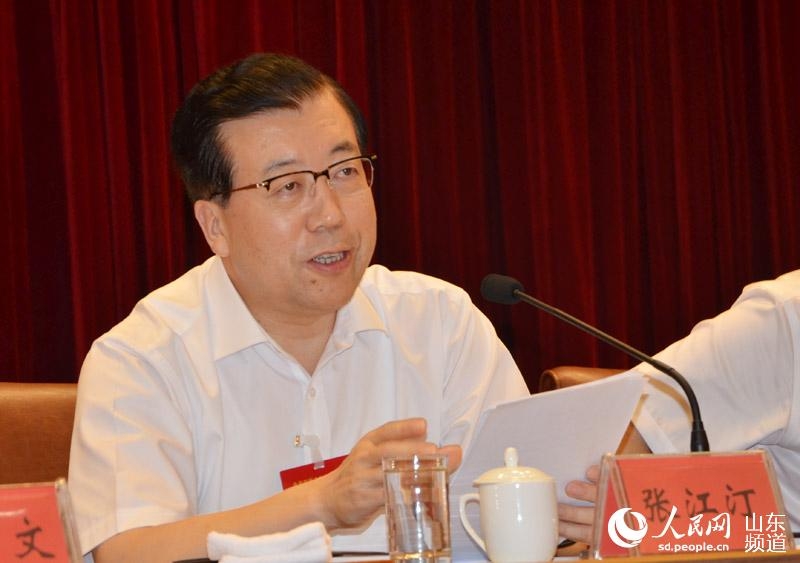山东省委常委、政法委书记张江汀出席会议并讲话,他强调要注重建设的系统性、整体性,从地面、地下、空中、海域、网络五个方面统筹规划,统筹资源、统筹力量,实现全方位、立体化。(摄影:胡洪林)