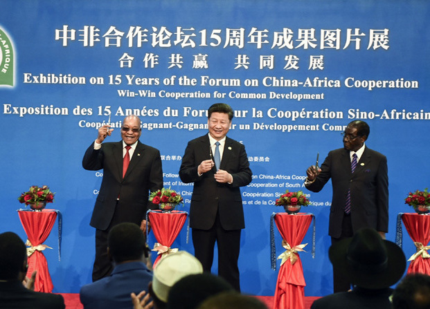 12月4日,国家主席习近平在约翰内斯堡出席中非合作论坛15周年成果图片展开幕式,同南非总统祖马,非盟轮值主席、津巴布韦总统穆加贝一道为展览剪彩。[详细]