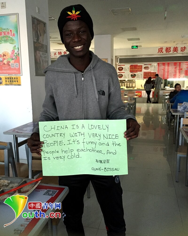 在北京语言大学餐厅,记者遇到来自几内亚比绍的马塔尼亚。马塔尼亚在中国只有两三个月,当问到在中国的最大感受时,他说:“中国人很nice很cool,但是天气太冷,真是又cool又cold。”在纸上,他很认真地写下:中国是个有很好人民的可爱国家,人们互相帮助。中国天气很冷。中国青年网实习记者 解轶鹏 摄
