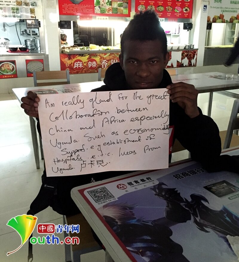 来自乌干达的卢卡思喜欢踢足球。他说中国帮了非洲很多,比如医药和教育。中非关系一直很和睦,他希望中国能够多帮帮乌干达。到了中国以后,他觉得中国人很友好。他说,中非合作很多是经济和贸易的往来。卢卡思对习主席出访非洲的新闻很关注,“我很开心中国和非洲特别是乌干达的合作很愉快,(中国给了非洲)很多经济援助,比如帮助建设医院。”中国青年网实习记者 解轶鹏 摄