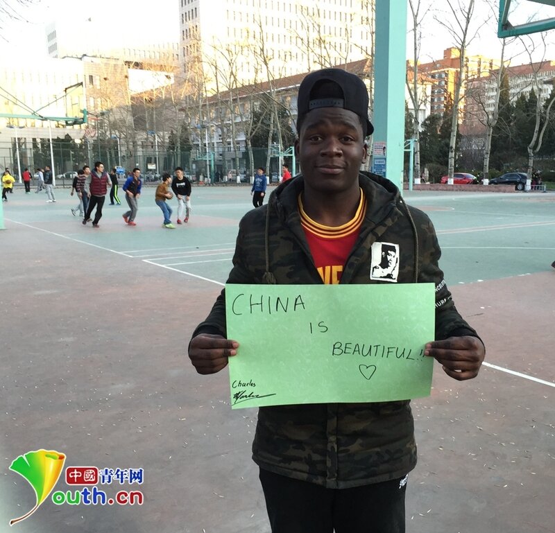 在北京语言大学篮球场遇到查理斯的时候,他正在和卢克一起教两个中国小学生打篮球。查理斯是北京理工大学的学生,为了教两个中国小朋友特意到语言大学。他非常喜欢打篮球,还向记者展示了自己打篮球的照片。查理斯在自己写下的“中国很漂亮”旁边还画了一颗心。中国青年网实习记者 解轶鹏 摄