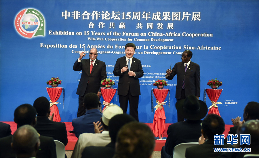 12月4日,国家主席习近平在约翰内斯堡出席中非合作论坛15周年成果图片展开幕式,同南非总统祖马,非盟轮值主席、津巴布韦总统穆加贝一道为展览剪彩。新华社记者 谢环驰 摄