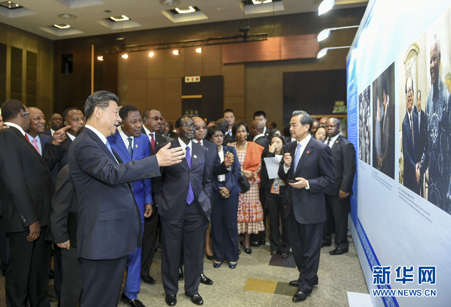 12月4日,国家主席习近平在约翰内斯堡出席中非合作论坛15周年成果图片展开幕式,同南非总统祖马,非盟轮值主席、津巴布韦总统穆加贝一道为展览剪彩。这是习近平同非洲国家和地区组织领导人观看展览。新华社记者 谢环驰 摄