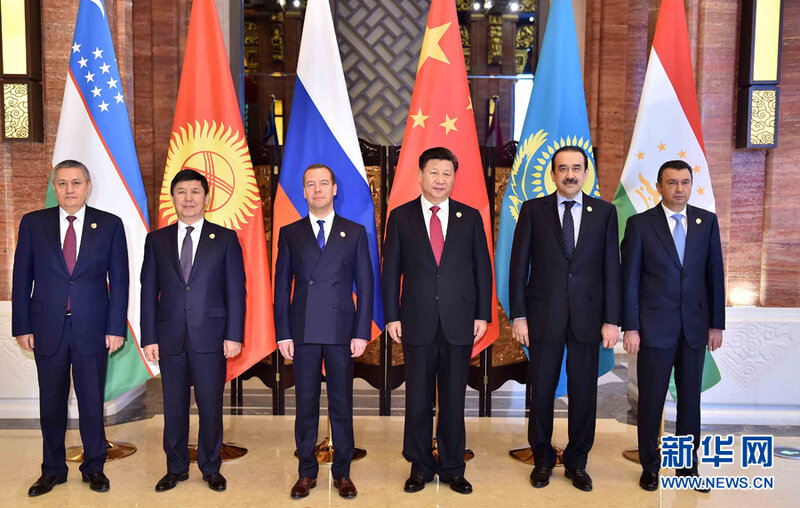 12月16日,国家主席习近平在浙江省乌镇集体会见上海合作组织成员国领导人哈萨克斯坦总理马西莫夫、吉尔吉斯斯坦总理萨里耶夫、俄罗斯总理梅德韦杰夫、塔吉克斯坦总理拉苏尔佐达、乌兹别克斯坦第一副总理阿齐莫夫。新华社记者 李涛 摄
