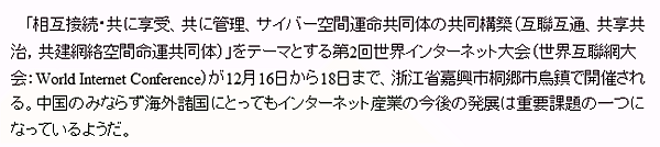 第二届世界互联网大会于12月16日至18日在浙江省嘉兴市桐乡市乌镇举行。本届大会的主题是“互联互通•共享共治,构建网络空间命运共同体”。互联网产业不仅对中国,对其他国家来说也成为今后发展的重要课题之一。