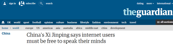 英国《卫报》网站则对习近平提出的构建良好的网络秩序进行了报道,并特别提到了习近平演讲中的“网络空间不是’法外之地’”的表述:“网络空间同现实社会一样,既要提倡自由,也要保持秩序。自由是秩序的目的,秩序是自由的保障。我们既要尊重网民交流思想、表达意愿的权利,也要依法构建良好网络秩序,这有利于保障广大网民合法权益。”
