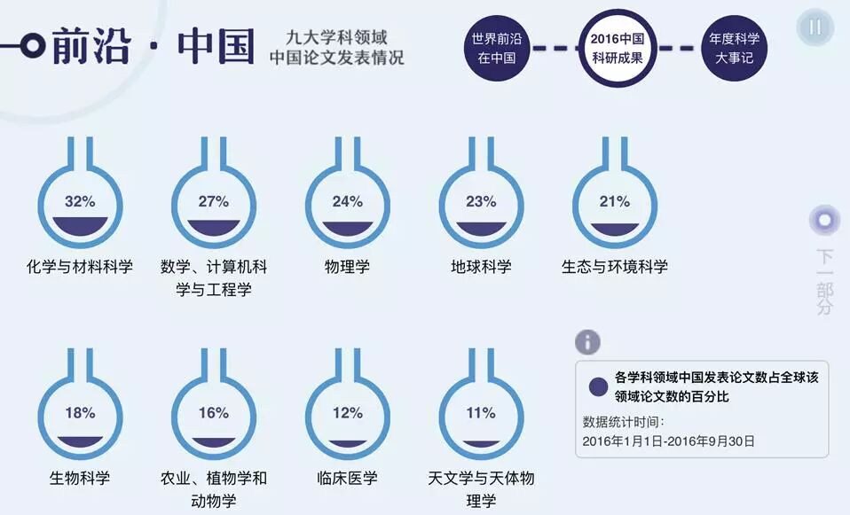 在自然科学的九大学科领域中,中国的论文发表数量均占到全球论文数量的十分之一以上。在化学与材料科学领域中,中国的论文数量优势更是扩大到32%。