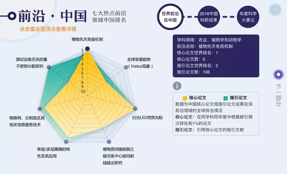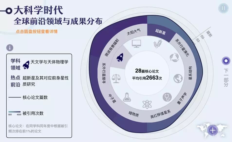 由央视新闻出品,武汉大学镝次元数据传媒实验室制作,中国科学院与Clarivate Analytics提供数据支持,这个充满操作乐趣的H5作品里融合了世界与中国各个前沿学科的学术成果,点击圆盘图,你就可以看到全球学者在天文学、物理学、计算机学、化学等多个学科领域发表了多少论文,而这些论文在后来者的研究中又如何被反复引用。