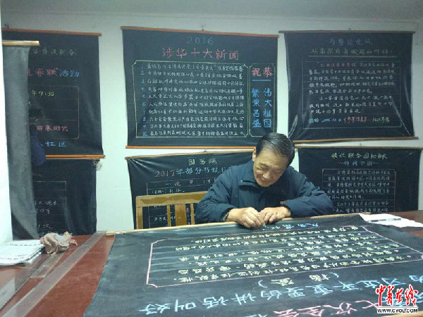 福州市仓山区对湖街道师大社区里,有一位善用黑板报宣传党政要闻和社会热点而被大家誉为“黑板报总编”的共产党员黄以孟。每天清晨,这位85岁高龄的老人步行一小时在周围五个社区挂、换新的黑板报,简明扼要,构图生动传神,10年来,他制作的黑板报已达2123期。(记者 傅晓羚)
