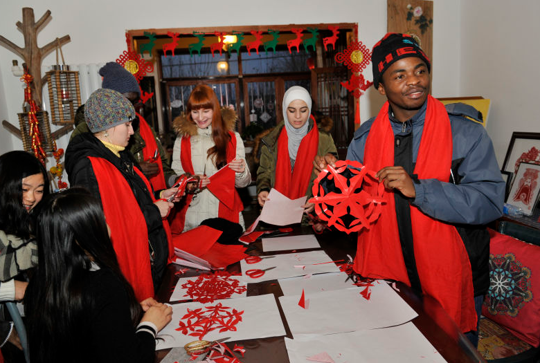 除了包饺子外,传统的民俗更是吸引着这些外国留学生。特色民宿里红灯高挂,各式窗花将温暖的小屋装点得春意盎然,在剪纸非遗传承人的指导下,各国留学生兴高采烈地裁剪出自己心仪的图案,相互比较着谁剪得更漂亮。