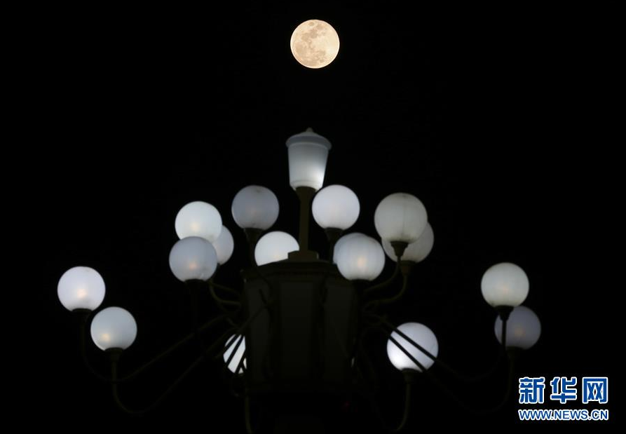 这是2月11日在江苏省盱眙县迎宾公园拍摄的月亮与路灯。当日是正月十五元宵节。 新华社发(颜怀峰 摄)