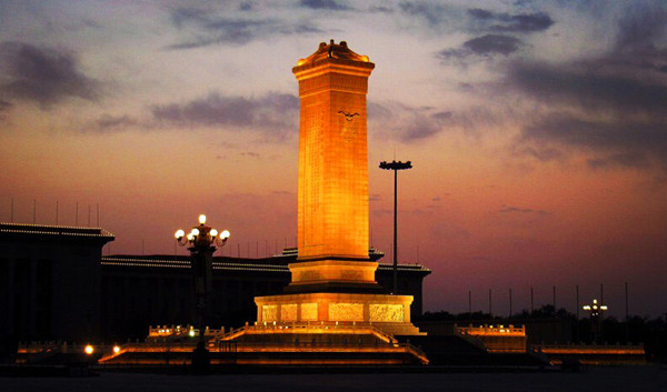 人民英雄纪念碑(Monument to the People's Heroes)位于北京天安门广场中心,在天安门南约463米,正阳门北约440米的南北中轴线上,是中华人民共和国政府为纪念中国近现代史上的革命烈士而修建的纪念碑。 1949年9月30日,中国人民政治协商会议第一届全体会议决定,为了纪念在人民解放战争和人民革命中牺牲的人民英雄,在首都北京建立人民英雄纪念碑。1949年9月30日奠基,1952年8月1日开工,1958年4月22日建成,1958年5月1日揭幕,1961年被中华人民共和国国务院公布为第一批全国重点文物保护单位之一。 人民英雄纪念碑通高37.94米,正面(北面)碑心是一整块花岗岩,长14.7米、宽2.9米、厚1米、重60.23吨,镌刻着毛泽东同志1955年6月9日所题写的“人民英雄永垂不朽”八个金箔大字。背面碑心由7块石材构成,内容为毛泽东起草、周恩来书写的150字小楷字体碑文。