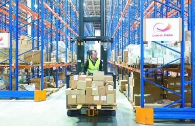 在位于俄罗斯莫斯科东南部的一家中国跨境电商物流企业的海外仓,工作人员正在运送货物。新华社发