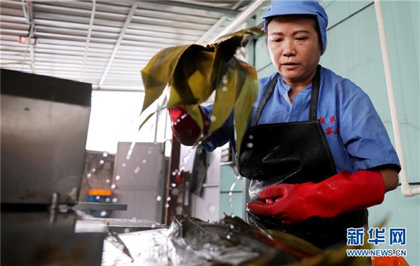 5月30日,在浙江嘉兴一个食品车间内,工人将用滚筒清洗机清洗好的箬叶码放整齐。 端午节前夕,浙江嘉兴的企业加紧制作各色传统粽子名点,为实体店和电商平台的节日销售准备货品。 新华社记者 方喆 摄