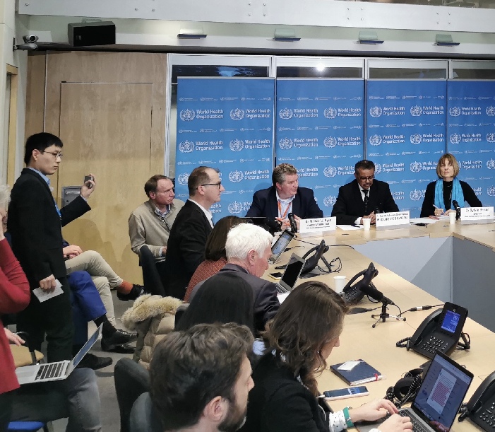 新华社日内瓦分社视频记者杜洋(左一)在记者会上向世卫组织总干事谭德塞提问。