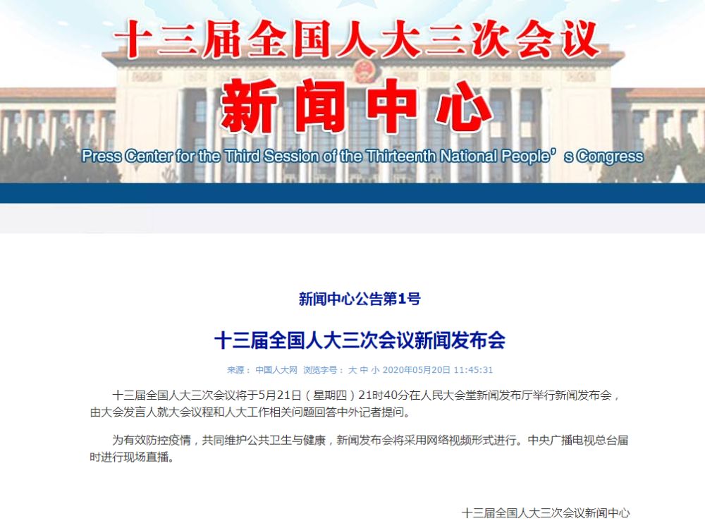 十三届全国人大三次会议将于5月21日(星期四)21时40分在人民大会堂新闻发布厅举行新闻发布会,由大会发言人就大会议程和人大工作相关问题回答中外记者提问。