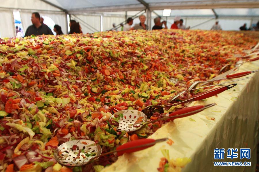 9月23日,约1000名志愿者在罗马尼亚首都布加勒斯特共同制作了一份19.05吨重的蔬菜沙拉,打破吉尼斯世界纪录。这份沙拉共使用6吨西红柿、4吨绿叶沙拉、4吨黄瓜、2吨柿子椒、2吨洋葱、2吨胡萝卜、400公斤橄榄、800升橄榄油和400公斤盐。新华社发(佩特雷斯库摄)(毛思倩、杨纯编辑)