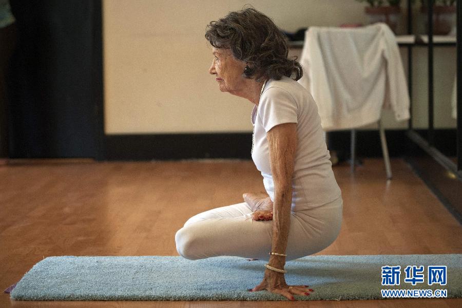5月14日,在美国纽约哈茨代尔,瑜珈教练林奇在教室里练瑜珈。现年93岁的林奇是吉尼斯世界纪录认定的“世界上年龄最大的瑜珈教练”。新华社/路透(毛思倩、杨纯编辑)