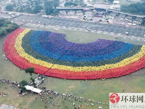2004年9月18日,菲律宾工业大学为庆祝建校100周年,31000名学生和教职工组成了这个人造彩虹,打破了吉尼斯世界记录。