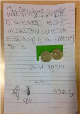 5岁女童打破饰品道歉信黏2英镑 天真反应惹人爱