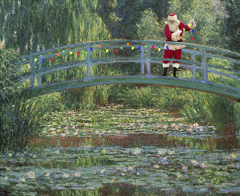 在波提切利的名画《维纳斯的诞生》中,威勒将站在贝壳上的维纳斯换成了扮成圣诞老人的自己,并且摆出模仿原画中维纳斯的姿势,十分有喜感。在莫奈1899年的名画《日本人行桥》中,圣诞老人提着一串彩灯站在画中的桥上。这名来自费城的艺术家用了几年时间,创作出十几幅这样的作品,让圣诞老人先后出现在波提切利、莫奈、柯立芝和卡拉瓦乔等名家的油画中。