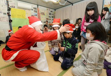 12月23日傍晚,装扮成圣诞老人的志愿者来到日本仙台市宫城野区的临时安置房,向住在这里的东日本大地震灾民赠送了礼物。