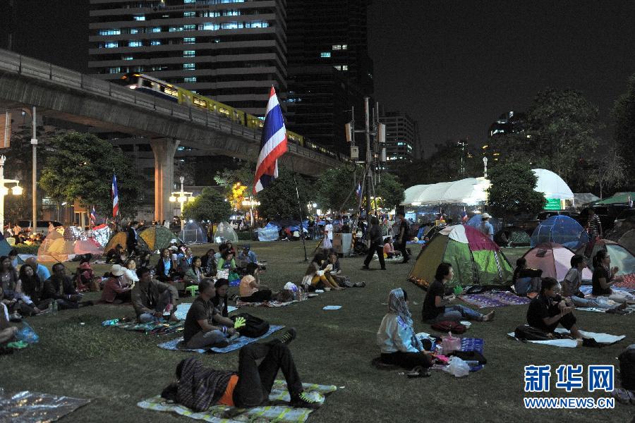 1月21日,反政府人士在泰国曼谷是隆路的隆披尼公园门口休息。泰国看守政府副总理差林21日宣布在曼谷及其周边地区实施紧急状态法,法令从22日开始实施,为期60天。新华社记者高健钧摄