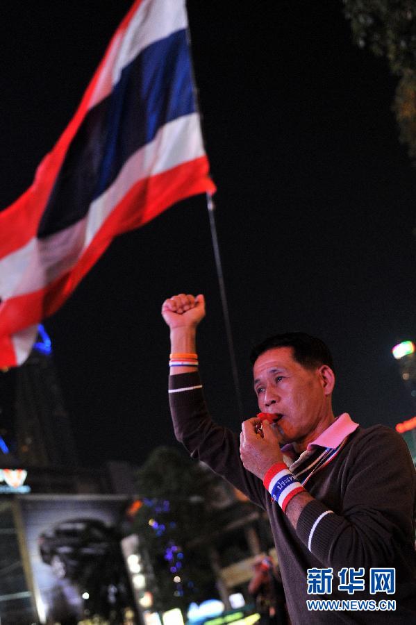 1月21日,在泰国曼谷的商业中心,一名反政府人士在集会上吹哨子。泰国看守政府副总理差林21日宣布在曼谷及其周边地区实施紧急状态法,法令从22日开始实施,为期60天。新华社记者高健钧摄