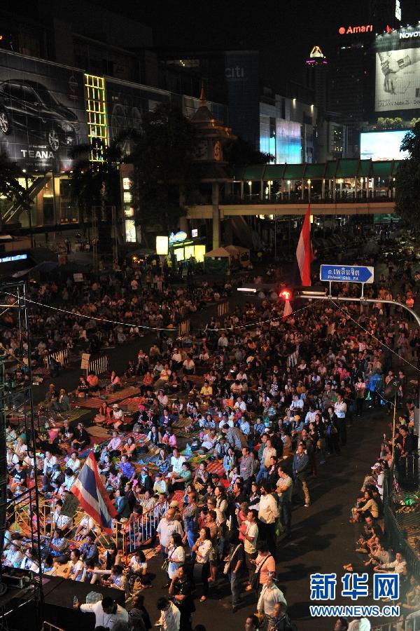 1月21日,在泰国曼谷的商业中心,反政府人士参加集会。泰国看守政府副总理差林21日宣布在曼谷及其周边地区实施紧急状态法,法令从22日开始实施,为期60天。新华社记者高健钧摄