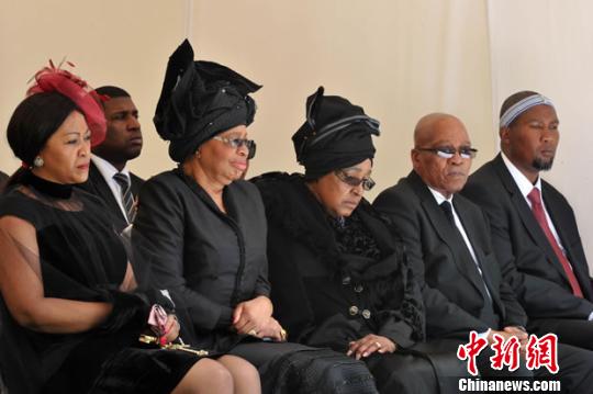 南非总统祖马(右二),与曼德拉家族的主要成员,其孙子门德拉、前妻温妮、遗孀格拉萨以及长女马卡兹维一起出席曼德拉的葬礼。