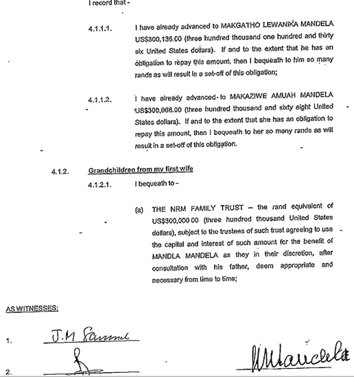 莫塞尼基向媒体宣读了这份长达20多页的遗嘱内容,曼德拉对他三位妻子的子女与孙辈都有所惠及。遗嘱显示,曼德拉已给了在2005年死于艾滋病的儿子马克贾托、三名在世的女儿每人30万美元(约合330万兰特),他还给格拉萨与前夫萨莫拉·马谢尔的两个孩子每人300万兰特。马克贾托一支作为家族的继承者,将获得约翰内斯堡房产。曼德拉给两个儿子留下的孙辈每个人30万美元,给外孙和曾孙以及格拉萨的孙辈每个人10万兰特。此外,一直照顾他的私人助理拉格兰吉等9名身边工作人员也将分别获得5万兰特。