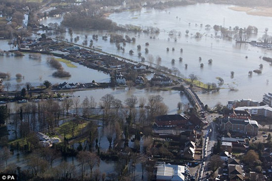 英国萨里郡的俯瞰图,洪水肆虐已造成多人伤亡。