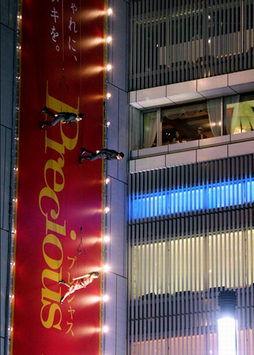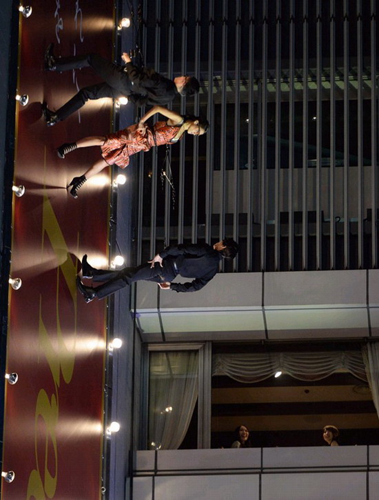 国际在线专稿:据日本《朝日新闻》5月8日报道,日本东京银座7日上演了一场“飞檐走壁”式时装秀。模特身着高级品牌服装,吊着威亚,在42米高的“墙壁T台”为观众献上了华丽的表演。
