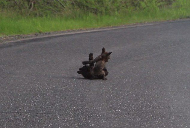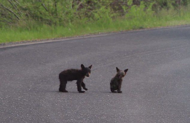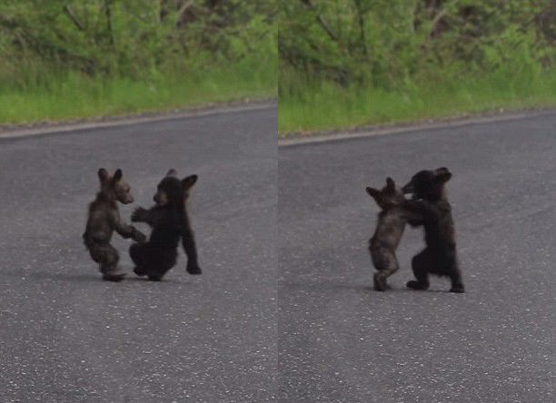 公园两只熊崽公路上掐架 萌煞路人