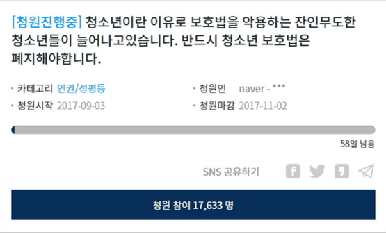 韩国民众到韩国总统府青瓦台官网请愿,呼吁废除青少年保护法。