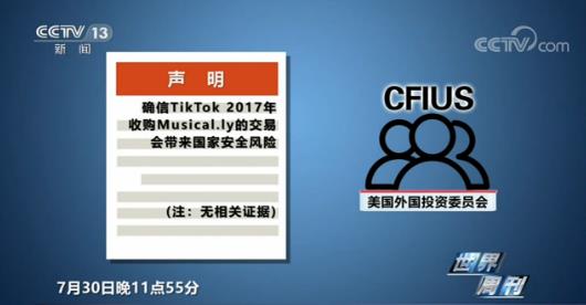 7月30日晚11点55分,就在距离该委员会法定审查期限仅剩5分钟的时候,外国投资委员会发表声明称:确信TikTok 2017年收购Musical.ly的交易会带来国家安全风险,但声明中没有提供相关证据。