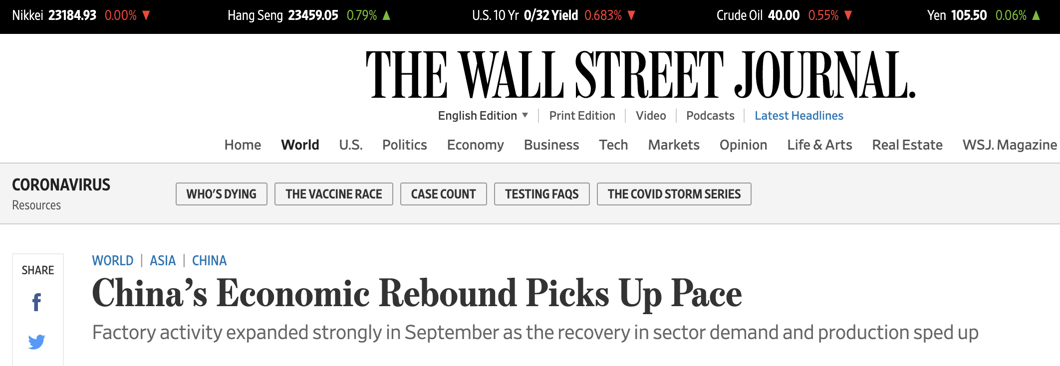 《华尔街日报》9月30日报道称,中国政府出台的扶持措施提振了制造业,国际市场需求出现局部反弹,中国经济在9月积聚了更多动力。