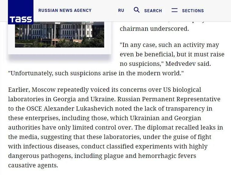 俄罗斯联邦安全委员会副主席梅德韦杰夫20日表示,美国不仅在独联体国家部署生物实验室,而且还努力在世界各地推广扩建。然而这些实验室从事的研究是不透明的,这与国际社会和国际组织的相关准则背道而驰。