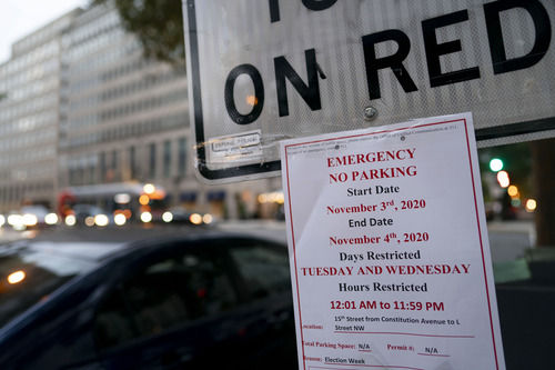 10月31日,美国华盛顿,白宫附近一处交通指示牌上贴着通知,要求选举日禁止在当地停车。新华社记者刘杰摄