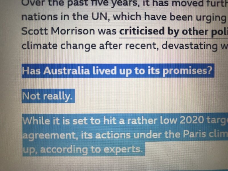 英国广播公司的报道认为,澳大利亚并未遵守巴黎协定的承诺,其应对气候变化的表现可以直接说是不合格。