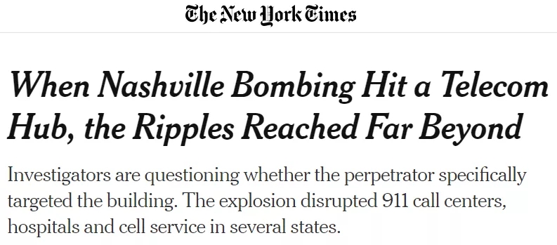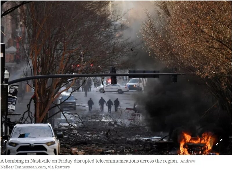 美国今年的年末假期注定被一些不和谐的东西扫了兴:在平安夜钟声敲过没多久之后的圣诞节当天清晨,田纳西州首府纳什维尔市中心就被一声巨响惊醒。一起“事先警告”的房车爆炸事件造成3人受伤和数十座建筑损毁,并导致该地区的大部分无线服务中断。