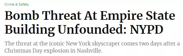 就在这起爆炸发生两天后,纽约市地标性建筑帝国大厦于当地时间12月27日收到炸弹威胁。不过,警方出动防爆小组到现场紧张排查后,却发现此次威胁“似乎没有事实根据”。
