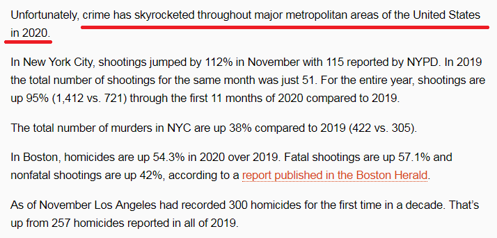 马萨诸塞州《洛厄尔太阳报》也发表题为《暴力犯罪:2020年的致命副产品》的文章指出,在2020年的美国,无论是纽约、波士顿、洛杉矶、费城、休斯敦、芝加哥、华盛顿这样的大城市,还是密尔沃基、格兰德拉匹兹等中小城市,暴力犯罪率都出现了直线上升。