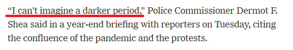2020年至今,纽约市已记录447起凶杀案,使今年成为这个美国最大城市近10年来“最血腥的一年”。用纽约市警察局长德莫特·谢伊在12月29日年度简报会上的话说:“我无法想象出还会有什么时候比现在更黑暗。”