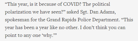 2020年即将过去,但留给人们的疑惑却挥之不去,到底是什么让美国深陷暴力漩涡?或许密歇根州格兰德拉匹兹市警察局发言人丹·亚当斯的回答可以给出一个不算答案的答案:“今年的悲剧是因为新冠肺炎吗?还是我们看到的政治极化?今年是独一无二的一年。我不认为你能告诉任何人‘为什么’”。