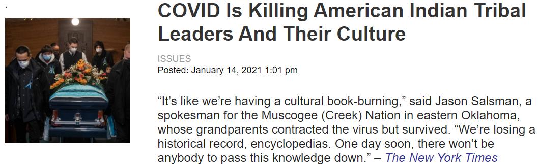 △《纽约时报》2021年1月14日报道称“新冠肺炎正在杀死美国原住民的部落长老,并断绝他们的文化”。(图片来源:《纽约时报》)