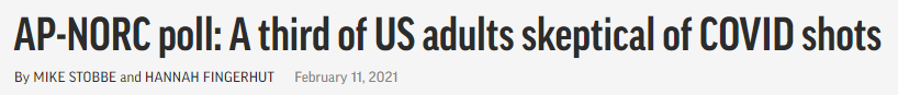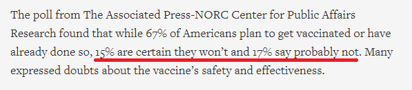 不仅供应和分配系统出了问题,美国民众对于疫苗安全性等问题的担忧也影响了疫苗接种速度。据美联社报道,一项新的民调显示,有1/3的美国人表示,他们肯定或者很可能不会接种新冠疫苗。