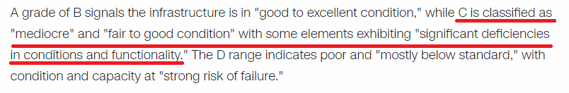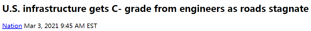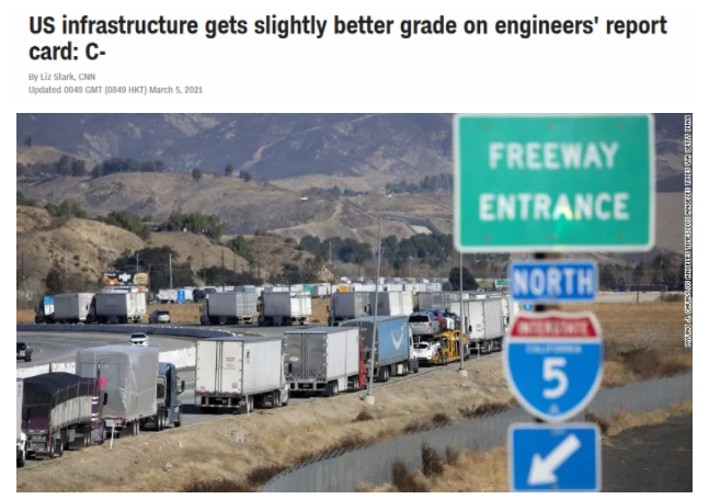 如果按照美国绝大多数学校要求通过课程的成绩达到“C”以上的标准,“C-”也可在某种程度上被视为“不及格”。堂堂世界第一大经济体的基础设施为何如此不堪呢?