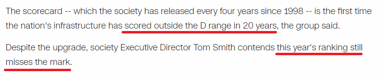 薄弱的基础设施一直是美国社会的一个痛点。尽管此次的评分只有可怜的“C-”,但这已经是20年来美国基础设施状况得分首次超过“D”的水平了。用ASCE执行董事托马斯·史密斯的话说,今年的评分仍然没有达标,“如果我们不采取紧急行动,未来将面临巨大的经济损失,我们的生活质量将进一步下滑”。